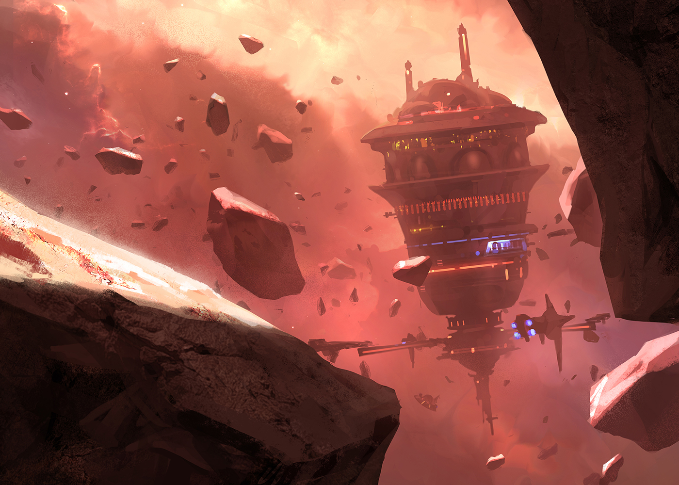 Les explorateurs dirigèrent les lampes fixées à leur tenues vers les ruines. Des signes étrangers était gravés sur leurs lisses et sombres surfaces et semblaient luire dans la lumière. Quelque chose se défaisait lentement sous leurs yeux. Une ombre montait de la surface de la lune morte, vers le ciel étoilé.